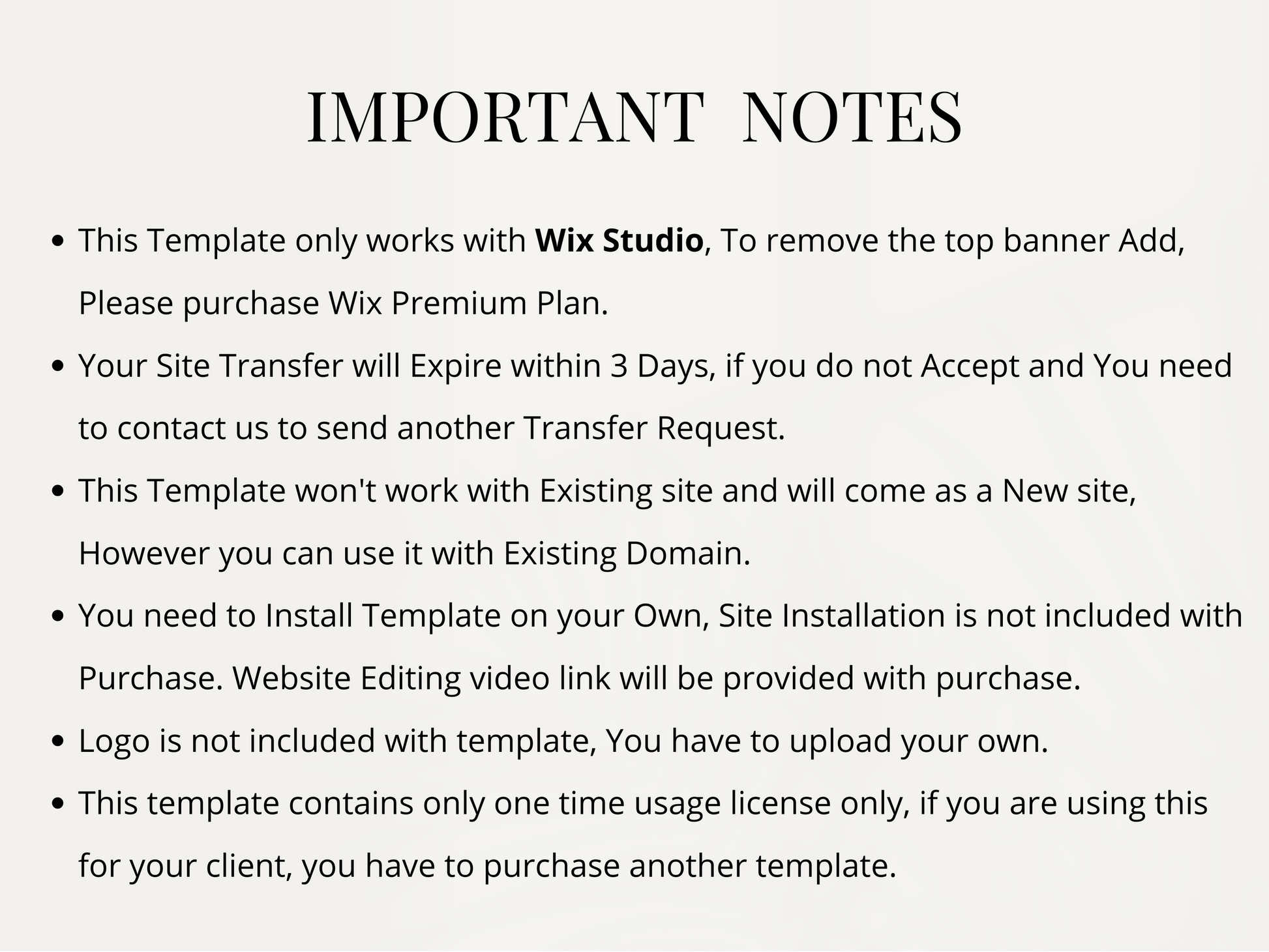 • Site Domain or Wix Premium Plan is Not Included with Template.